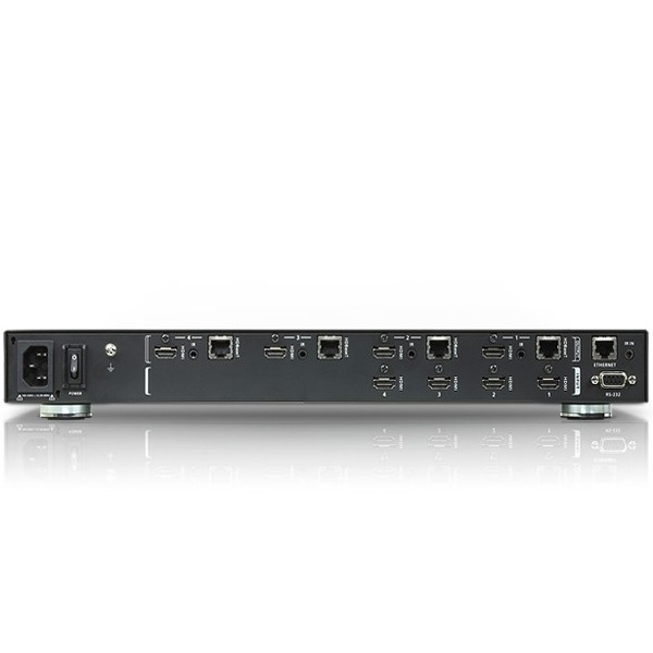 มี 4 HDMI Input รองรับ 4 Output แบบ HDBaseT และ 4 HDMI Output สำหรับต่อจอ ณ จุดต้นทาง (HDBaseT output และ HDMI output ภาพเหมือนกัน)