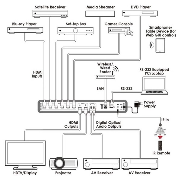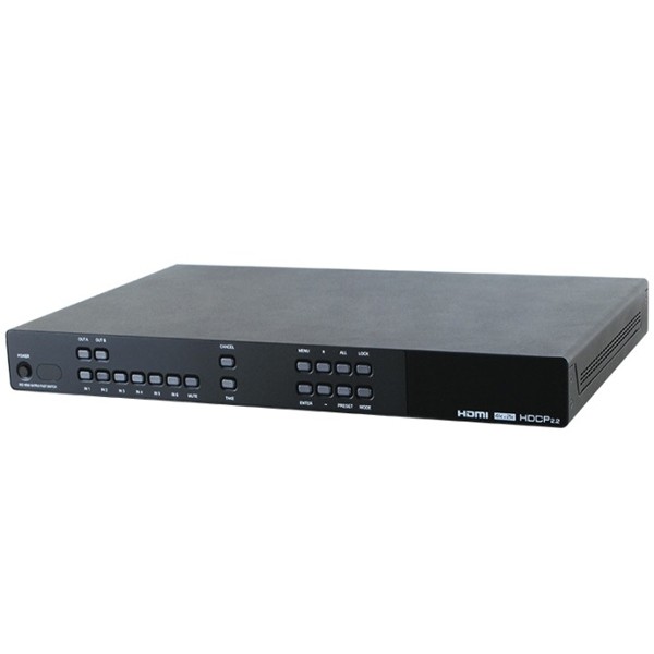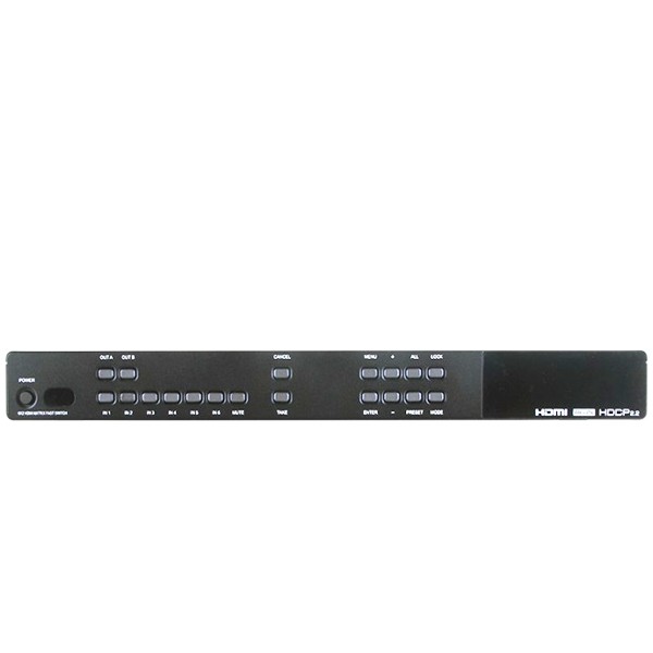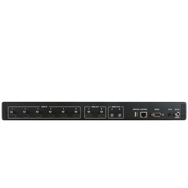 อุปกรณ์สลับสัญญาณวิดีโอแบบเมตริก เข้า 6 ออก 2 มีคุณสมบัติ View All, Picture-in-Picture (PIP), มีเทคโนโลยีที่สามารถสลับสัญญาณได้รวดเร็ว, รองรับความละเอียดวิดีโอ 4K2K, 3D ควบคุมได้จากปุ่มกด, รีโมท, RS-232 และ Ethernet