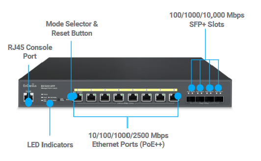 | พอร์ตเชื่อมต่อ | (8) 10/100/1000/2500 Mbps Ports (4) SFP+ Port |