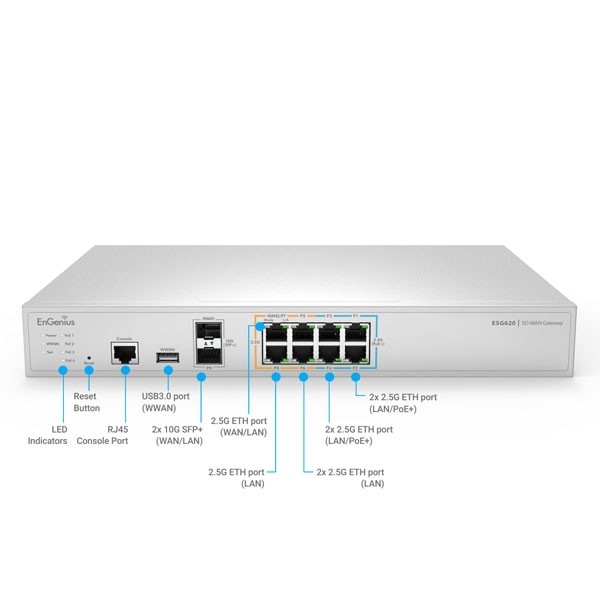 EnGenius ESG620 (Gateway6 8mG 2SFP+) Cloud-Managed VPN and SD-WAN with 8x 2.5-Gigabit (4 PoE+) Ethernet ports + 2 SFP+ slots, Rack-Mountable Steel Case