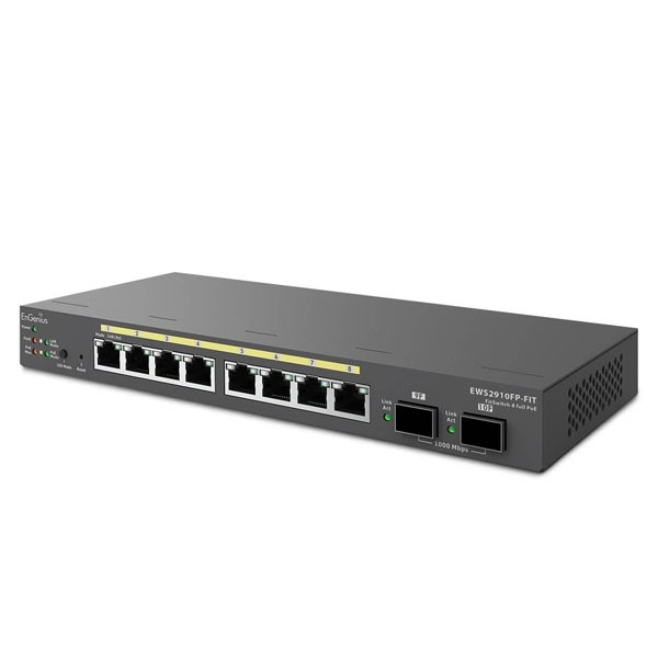 อุปกรณ์ L2 Cloud Managed PoE Switch สวิตซ์ EWS2910FP-Fit บริหารจัดการได้ระดับ L2 Plus มี 8 พอร์ตกิกะบิต มาตรฐาน 802.3af/at จ่ายไฟ PoE รวม 110 วัตต์ ต่อพอร์ตสูงสุด 30 วัตต์ และมี 2 พอร์ต SFP กิกะบิตเป็นพอร์ต Uplink สำหรับต่อสายไฟเบอร์ออฟติก, ทำงานจ่ายไฟพร้อมส่งข้อมูลได้ระยะไกลสูงสุด 100 เมตรหรือ 328 ฟุต เหมาะสำหรับใช้กับอุปกรณ์ AP, กล้อง IP และโทรศัพท์ VoIP, การทำงานในระดับ Layer 2 รองรับการทำ Vlan, Link Aggregation, Static Route, รองรับการ Monitor และจัดการผ่าน EnGenius Cloud FitXpress โดยผ่าน Web Browser (URL: https://fit.engenius.ai) และบนแอพพลิเคชั่นบนมือถือ Cloud FitXpress ได้ฟรี!.ไม่มีค่าใช้จ่าย
