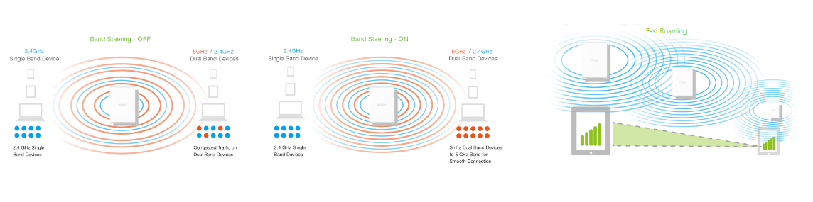 Band Steering : สำหรับ AP ที่ปล่อยสัญญาณ 2 ย่านความถี่ (Dual Band) ทั้ง 2.4 และ 5GHz นั้น สามารถเปิดใช้ฟังก์ชัน Band Steering จะทำการควบคุมให้เครื่อง Client User ให้เลือกเชื่อมต่อกับย่านความถี่ที่เราต้องการได้ ซึ่งปัจจุบันเรามักเลือกให้มือถือหรือเครื่อง Client User มาใช้ที่ย่าน 5GHz ก่อนซึ่งให้คุณภาพและความเร็วใช้งานที่สูงกว่าย่าน 2.4GHz มาก