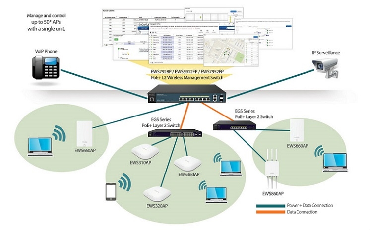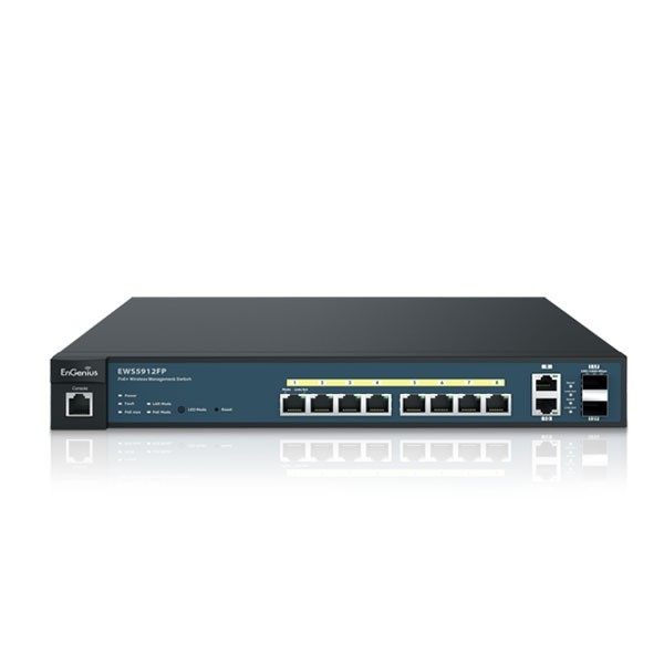 อุปกรณ์ PoE สวิตซ์ EWS5912FP บริหารจัดการได้ระดับ L2 มี 8 พอร์ตกิกะบิต PoE มาตรฐาน 802.3af/at จ่ายไฟรวม 130 วัตต์ ต่อพอร์ตสูงสุด 30 วัตต์ และมี 2 พอร์ตกิกะบิต Uplink พร้อม 2 พอร์ต SFP รองรับการต่อสายไฟเบอร์ออฟติก, ทำงานจ่ายไฟพร้อมส่งข้อมูลได้ระยะไกลสูงสุด 100 เมตรหรือ 328 ฟุต รองรับสายแลน CAT5e และ CAT6, EWS5912FP เป็น Controller ในตัวควบคุมไวเลสตระกูล EWS ได้สูงสุด 50 AP เหมาะสำหรับใช้กับอุปกรณ์ AP, กล้อง IP และโทรศัพท์ VoIP ที่ต้องการความเสถียรและความเร็วสูง