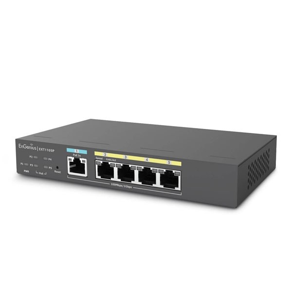 อุปกรณ์ Extender PoE Switch รุ่น EXT1105P ขนาด 5 พอร์ต Gigabit Ethernet ที่มาพร้อมกับฟังก์ชั่น PoE ทั้งแบบจ่ายไฟ PoE+ (802.3 af/at) และรับไฟ (PD PoE) โดยมีพอร์ต Gigabit Ethernet 4 พอร์ตสำหรับจ่ายไฟให้กับอุปกรณ์เครือข่ายอื่นๆ, และ 1 พอร์ตสำหรับรับไฟเลี้ยง จาก PoE Switch หรือ PoE Adapter (รุ่นที่แนะนำ EPA5060GBT, EPA5090GBT) ที่มีมาตรฐานการจ่ายไฟแบบ 802.3bt (PoE++) เพื่่อทำให้สามารถติดตั้งใช้งานในสถานที่ที่ไม่มีปลั๊กไฟได้ พร้อมกำลังจ่ายไฟสูงถึง 60W สามารถจ่ายไฟให้กับอุปกรณ์ Access Point กล้อง IP หรือโทรศัพท์ IP ได้อย่างเต็มประสิทธิภาพ, มีฟังก์ชั่น Voice VLAN ที่ช่วยแยกการรับส่งข้อมูล Voice over IP (VoIP) และรองรับการทำ Port Isolation, รองรับ IGMP Snooping และอื่นๆ, มาพร้อมระบบตรวจสอบสถานะ และจัดการอุปกรณ์ต่างๆผ่าน EnGenius Cloud โดยผ่าน Web Browser (URL: https://cloud.engenius.ai) และบนแอพพลิเคชั่นบนมือถือ EnGenius Cloud To-Go ได้ฟรี!.ไม่มีค่าใช้จ่าย