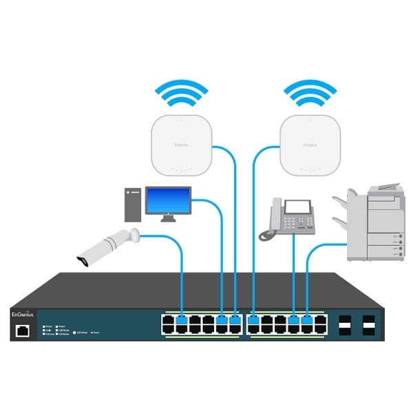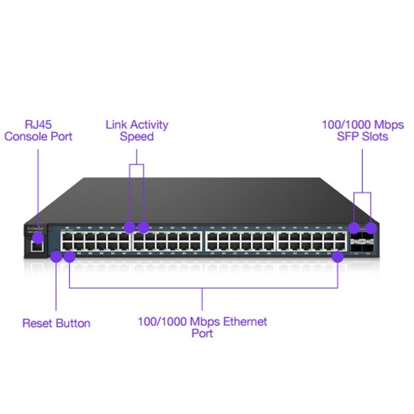 สวิตซ์ EnGenius รุ่น EWS1200-52T ขนาด 48 พอร์ต 10/100/1000Mbps Gigabit Ethernet และ 4 พอร์ต SFP รองรับการต่อไฟเบอร์ออฟติก มีความจุสูง 104Gbps Switch Capacity หน่วยความจำ SDRAM 256MB บริหารจัดการได้ ระดับ Layer 2 ง่ายต่อการคอนฟิก ดูสถาณะการทำงาน Network Troubleshooting, Email Alerts และควบคุม Wieless AP ด้วยฟังก์ชั่น ezMaster
