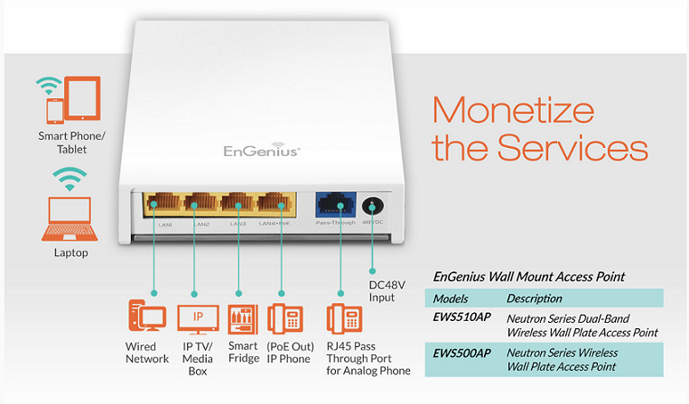 แอคเซสพอยต์ EWS500AP แบบติดเข้ากับผนังห้อง ปล่อยสัญญาณไวไฟและมี 4 พอร์ต LAN Switch ในตัว รองรับการต่อใช้งานเช่น Smart TV, Media Box, IP Phone, Smart Fridge หรือ Printer ให้ความเร็วไร้สายที่ 300Mbps ย่าน 2.4GHz กำลังส่ง 100mW(20dBm) รองรับการจ่ายไฟผ่านสายแลน PoE บริหารตั้งค่าได้ทั้งแบบ Stand-alone แบบ Controller Neutron network Management และ ezMaster เหมาะสำหรับห้องพักโรงแรม ออฟฟิต สำนักงาน และบ้านพักอาศัย