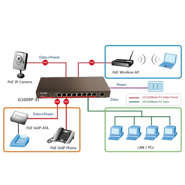 สวิตช์ G1009P-EI แบบ PoE ขนาด 9 พอร์ตแลน 10/100/1000 Mbps (Gigabit) + Uplink 1 พอร์ต 10/100/1000 BASE-TX, รองรับการจ่ายไฟฟ้าผ่านสายแลน POE มาตรฐาน 802.3at/af ได้จำนวน 8 Port รวมกำลังไฟสูงสุด 121.2W (IEEE802.3af (15.4W) 1-8 Port, IEEE 802.3at (30W) ) 1-4 Port, การติดตั้ง สามารถจัดวางบนโต๊ะ ตู้แร็ค หรือติดยึดกับพื้นผิว ผลิตจากวัสดุซึ่งเป็นโลหะทนทาน แข็งแรง
