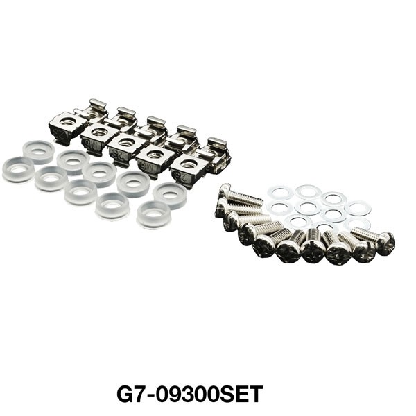 ชุดน๊อต G7-09300SET ใช้สำหรับขันยึดอุปกรณ์หรือถาดรองเข้ากับตู้แร็คมาตรฐาน ในถุงมีน๊อด 10 ชุด (1 ชุดมี 4 ชิ้น ประกอบด้วยน๊อตสกรู M6 (Screw M6), แป้นยึดตัวเมีย (Captive Nut) แหวนรองน๊อตและแหวนรองพลาสติกสีขาว (Plastic Washer)) ชุดน๊อตสีสแตนเลส