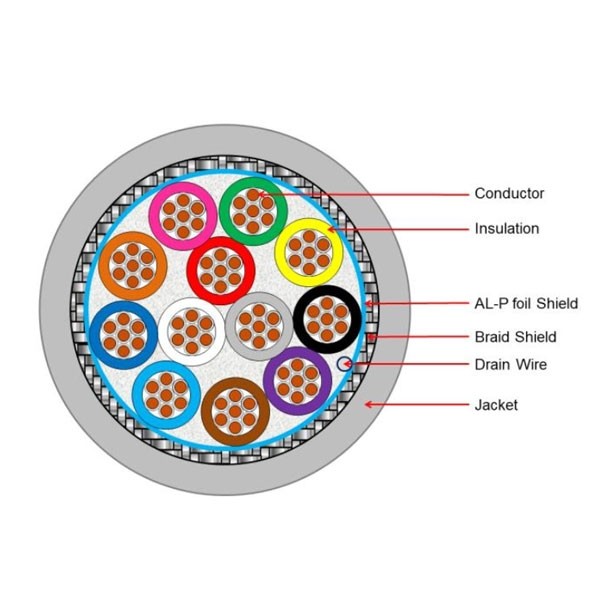 สายคอนโทรล CB-0250A แบบ Multi-Core ขนาด 12 Core มี Shield 2 ชั้น Braid Shield และ AL-P Foil Shield ขนาดสาย 24 AWG ออกแบบมาสำหรับเป็นสายนำสัญญาณควบคุมการวัดและการสั่งงาน เช่นการเชื่อมต่อระหว่างคอมพิวเตอร์, วงจรคอนโทรล Control Circuit, อุปกรณ์โรงงาน Industrial Equipment Control หรือใช้กับ EIA RS-232
