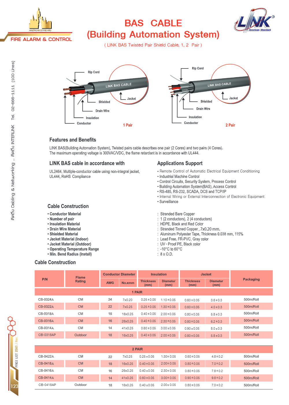 สาย BAS Cable รุ่น CB-0418AAP สายคู่ดำแดงขนาด 4x18 AWG Shield OUTDOOR ที่ป้องกันการรบกวนของสัญญาณจากภายนอก เป็นสายคอนโทรลที่ใช้ในระบบ Building Automation Systems ออกแบบมาเพื่อเชื่อมต่อระบบอำนวยความสะดวกต่างๆ ภายในอาคารเข้าด้วยกัน เป็นสายตามมาตรฐาน UL-RS485 ที่สามารถเดินได้ความยาวกว่า 1,000 เมตร Tinned Copper Also Available