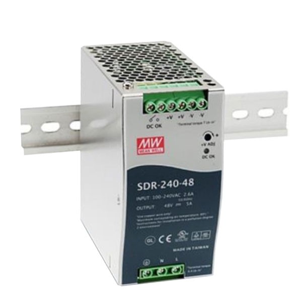 อุปกรณ์ DC Power Supply รุ่น PS-9124 เกรดงานอุตสาหกรรม สำหรับจ่ายไฟเลี้ยง PoE Switch Industrial ให้กำลังไฟ 240W, 48VDC มีฟังก์ชั่น PFC (PF>0.93) มีระบบป้องกันไฟ Short Circuit / Overload / Over Voltage มีไฟ LED แสดงสถานะการทำงาน รองรับการติดตั้งระบบ DIN rail TS-35/7.5 หรือ 15