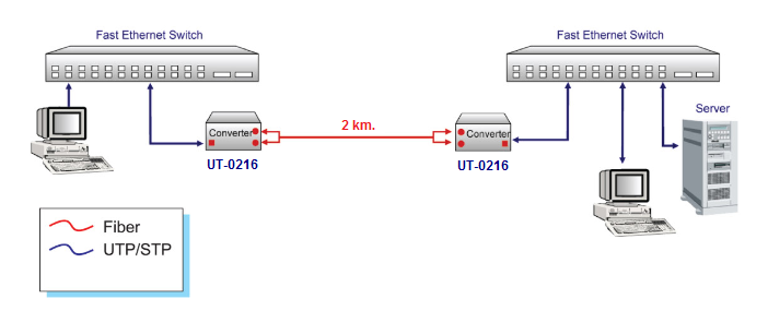 ไฟเบอร์มีเดียคอนเวอร์เตอร์ UT-0216 มี 1 พอร์ตแลน RJ45 และหัวต่อไฟเบอร์แบบ SC Connector ชนิดหลายโหมด (Multi-mode) รองรับความเร็ว 10/100 Mbps เชื่อมต่อสายไฟเบอร์ออฟติกได้ระยะไกลสูงสุด 2 กิโลเมตร ออกแบบมาเพื่อแปลงสัญญาณส่งผ่านสาย Fiber Optic โดยมีฟังก์ชั่นใช้งานครบถ้วนสมบูรณ์ เหมาะสำหรับติดตั้งภายในอาคาร รุ่นใหม่เปลี่ยนชื่อเป็น UT-0216EA