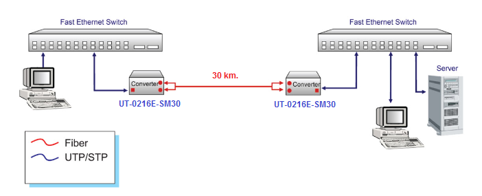 ไฟเบอร์มีเดียคอนเวอร์เตอร์ UT-0216E-SM30 มี 1 พอร์ตแลน RJ45 และหัวต่อไฟเบอร์แบบ SC Connector ชนิดโหมดเดี่ยว (Single-mode) รองรับความเร็ว 10/100 Mbps เชื่อมต่อสายไฟเบอร์ออฟติกได้ระยะไกลสูงสุด 30 กิโลเมตร ออกแบบมาเพื่อแปลงสัญญาณส่งผ่านสาย Fiber Optic และเพิ่มฟังก์ชั่น Link Fault Signaling (LFS) คือเมื่อเกิดปัญหาในระบบสายสัญญาณจะทำการสลับคู่สายไปใช้คู่สายสำรองโดยอัตโนมัติ เหมาะสำหรับติดตั้งภายในอาคาร รุ่นใหม่เปลี่ยนชื่อเป็น UT-0216EA-SM30