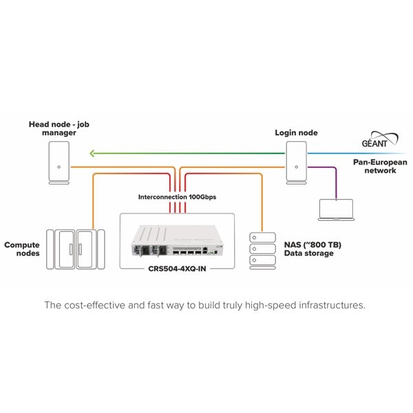 MikroTik CRS504-4XQ-IN 100GbE 4-Port QSFP28 + 1 x 100Mbit Ethernet port, MikroTik RouterOS v7, License level 5, Compatible with 40G, 25G, 10G, and 1G Fiber Connections, Rack-Mount kit (Included)