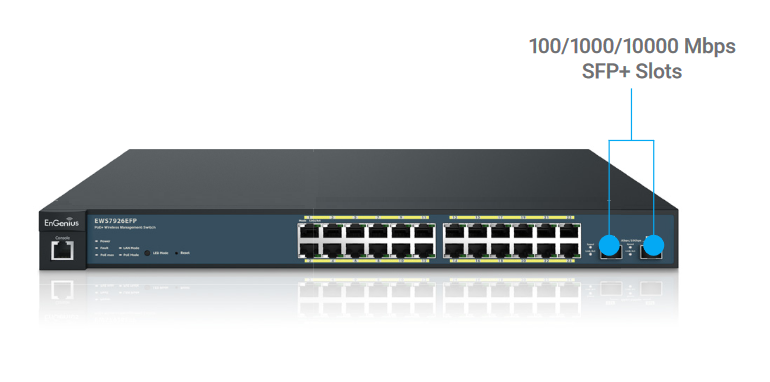 EnGenius EWS7926EFP เป็น L2 สวิตซ์ PoE พร้อม AP Controller ในตัว รองรับการควบคุมตระกูล Access Point Neutron Series บริหารจัดการได้สูงสุด 50 ตัว โดย EnGenius EWS7926EFP มีขนาด 24 พอร์ต PoE 802.3af/at จ่ายไฟมากถึง 410 วัตต์ และ 2 พอร์ต SFP+ ความเร็วสูง 10 Gigabit เพื่อการต่อขยาย Fiber Uplink รับส่งข้อมูลขนาดใหญ่ในระบบเครือข่ายได้อย่างรวดเร็ว ให้ประสิทธิภาพการทำงานที่สูง พร้อมฟังก์ชันของสวิตซ์ Layer 2 Management ครบถ้วน ออกแบบมาเพื่อการบริหารจัดการอุปกรณ์ AP ได้ง่ายขึ้น ในการตั้งค่า การดูสถานะการทำงานของ AP และการใช้งานของ User พร้อมรองรับการรีโมทจากระยะไกลเพื่อบริหารจัดการได้ด้วยโปรแกรม ezMaster ในการควบคุม Neutron Switch และ AP หลาย ๆ ตัว จากหลายไซต์งาน เสมือนเป็นเครือข่ายเดียวกันได้อีกด้วย
