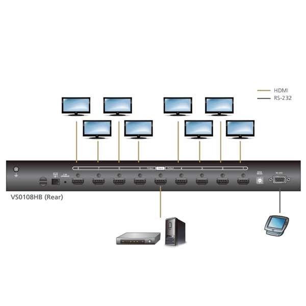 อุปกรณ์ 4K HDMI Splitter รุ่น VS0108HB ออกแบบมาสำหรับต่อขยายภาพวีดีโอความละเอียดสูงระดับ 4K แสดงผลออกได้ 8 ช่องพร้อมกัน มาตรฐาน HDMI 2.0, 4K 60Hz (4:4:4) มีระบบ EDID ตรวจสอบข้อมูลการเชือมต่อแสดงผลที่ดีที่สุดแบบอัตโนมัติและรองรับช่อง Dolby TrueHD และ DTS-HD Master Audio ใช้งานได้กับอุปกรณ์ที่มีพอร์ต HDMI ได้ทั้งหมดเช่นเครื่องเล่น DVD, กล่องรับสัญญาณดาวเทียม และจอแสดงผล HDMI ใน Home Theater Application เหมาะสำหรับงานเชิงพาณิชย์เช่น ศูนย์การศึกษา ห้องประชุมหรือสถานที่ต่างๆ ใช้งานง่ายระบบ Plug-and-play
