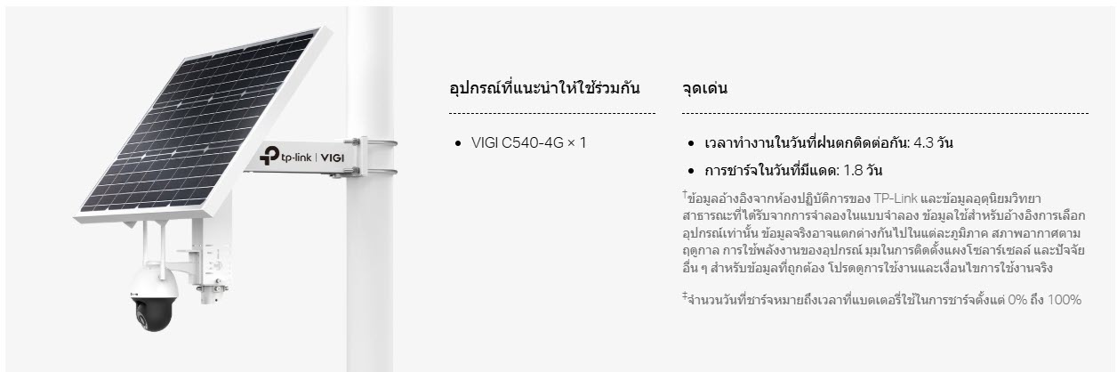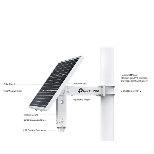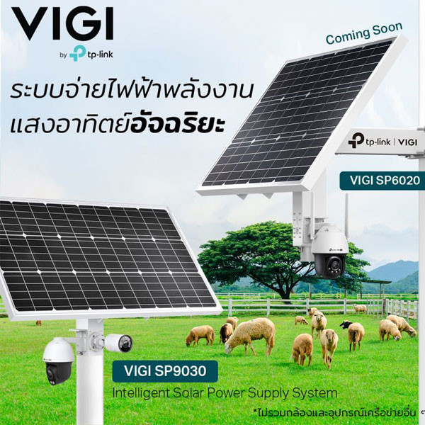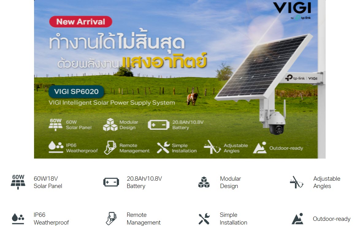ชุดอุปกรณ์แผงโซลาร์เซลล์ VIGI SP6020 ระบบชาร์จไฟ 60W/18V และแบตเตอรี่ Lithium 20.8Ah/10.8V (สามารถอยู่ได้ 2-4 วัน), มีพอร์ต DC Voltage Output จำนวน 3 ช่อง และพอร์ตแลน RJ45 1 พอร์ต (10/100Mbps) สำหรับต่อกล้องวงจรปิด (แนะนำรุ่น VIGI C540-4G) หรือ Access Point EAP Outdoor, แผงสามารถปรับองศาได้ เทคโนโลยี Auxiliary Heating ช่วยให้แบตเตอรี่สามารถทำงานได้เป็นปกติในช่วงของอุณหภูมิที่กว้างขึ้น มีมาตรฐานกันน้ำกันฝุ่น IP66, ควบคุมอุปกรณ์ผ่านแอป (VIGI app) ตรวจสอบการใช้พลังงาน, รับการแจ้งเตือนเมื่อแบตเตอรี่เหลือน้อย, อัปเดตเฟิร์มแวร์, และรีบูตระบบได้ ใช้งานได้อย่างสะดวกสบายไม่ว่าจะอยู่ที่ใดก็ตาม, รองรับการใช้งานกับกล้องวงจรปิดและ EAP Outdoor ออกแบบมาเพื่อใช้งานกับสถานที่ไฟฟ้าเข้าไม่ถึง หรือพื้นที่ห่างไกล