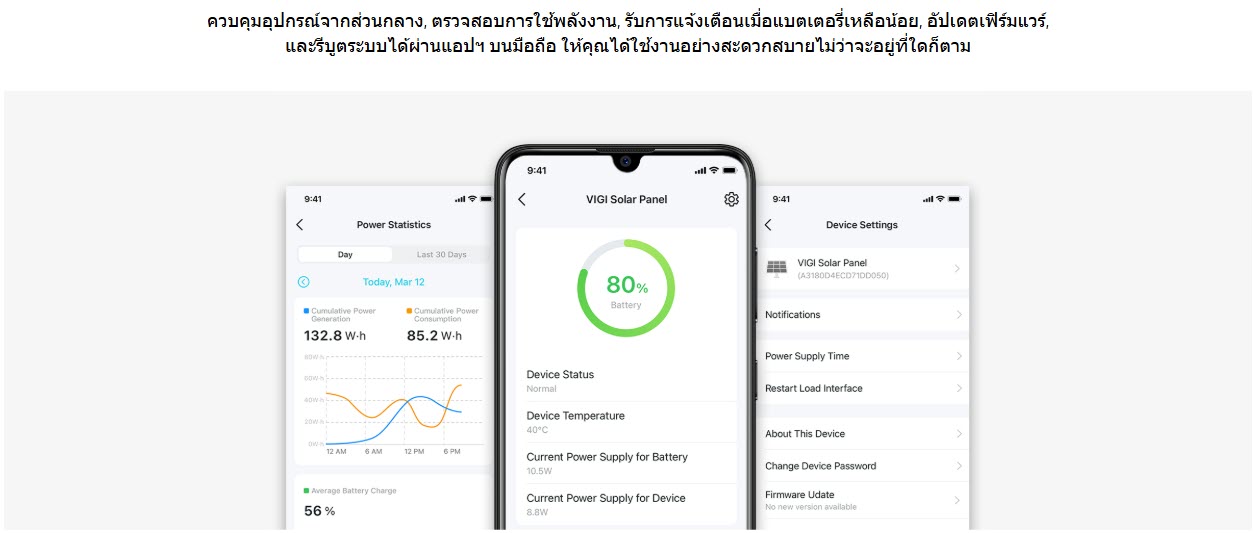 | คุณลักษณะเด่น | • แผงโซลาร์เซลล์ 60W/18V และแบตเตอรี่ Lithium 20.8Ah/10.8V • พอร์ต DC Voltage Output 3 ช่อง • รองรับการใช้งานกล้องวงจรปิดและ EAP Outdoor • ปรับองศาได้ 5°/15°/25°/35°/45°/55° • เทคโนโลยี Auxiliary Heating ช่วยให้แบตเตอรี่สามารถทำงานได้เป็นปกติในช่วงของอุณหภูมิที่กว้างขึ้น • ระบบควบคุมการชาร์จ Maximum Power Point Tracking (MPPT) • มาตรฐานกันน้ำกันฝุ่น IP66 • พอร์ตแลน RJ45 1 พอร์ต (10/100Mbps) สำหรับต่อกล้องวงจรปิดหรือ Access Point EAP Outdoor • จัดการอุปกรณ์จากระยะไกลและติดตั้งง่าย (VIGI app) |