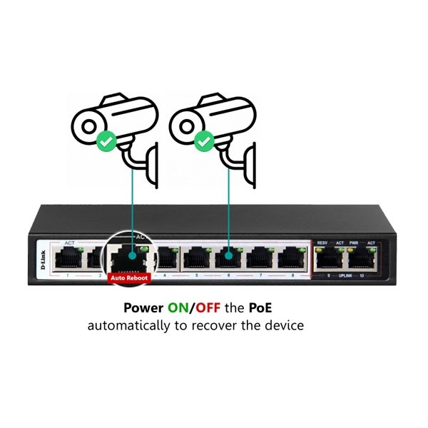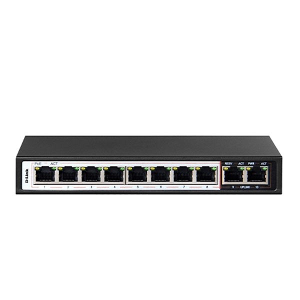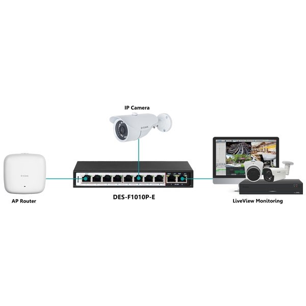 อุปกรณ์ PoE สวิตซ์ DES-F1010P-E ขนาด 10 พอร์ต 10/100Mbps โดยมี 8 พอร์ตแบบ RJ45 รองรับ PoE/PoE+ มาตรฐาน 802.3af & 802.3at จ่ายไฟ PoE รวม 96 วัตต์, และมี 2 พอร์ตแบบ RJ45 Uplink, สามารถจ่ายไฟพร้อมส่งข้อมูลได้ระยะไกลสูงสุด 100 เมตร, ตัวเครื่องเป็นโลหะแข็งแรงทนทาน เหมาะสำหรับใช้กับอุปกรณ์ AP, กล้อง IP และโทรศัพท์ VoIP ที่ต้องการความเสถียรและความเร็วสูง