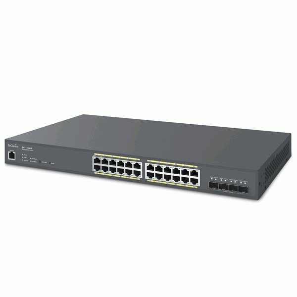 EnGenius ECS1528FP Cloud Managed 24-Port Gigabit PoE+ Network Switch, 4 SFP+ Ports, 802.3 at/af PoE+ Ready on All Ports with 410W PoE budget.