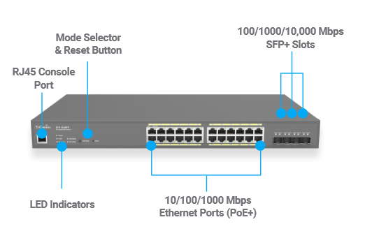 | พอร์ตเชื่อมต่อ | (24) 10/100/1000 Mbps Ports (4) SFP+ Ports |