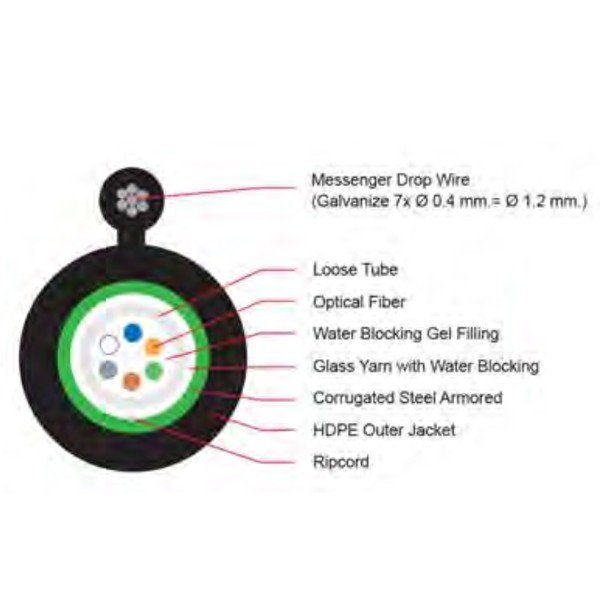 | วัสดุ | UV-resistant, black HDPE outer jacket เกราะเหล็กป้องกัน (Steel Armored) การถูกของมีคมและสัตว์กัดแทะ Messenger wire provide by 1.8 mm. galvanize steel wire |