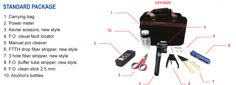 ชุดเครื่องมือไฟเบอร์เพาเวอร์มิเตอร์ UFH3020 สำหรับระบบ FTTH (Fiber to the Home) เหมาะสำหรับติดตั้งและดูแลระบบสายสัญญาณไฟเบอร์ออฟติก ครบชุดมาพร้อมกระเป๋าจัดเก็บง่ายต่อการนำพาไปใช้งาน ในชุดประกอบด้วย 1.Carrying bag (กระเป๋า) 2.Power meter 3.Kevlar scissors (กรรไกรตัดเคฟล่าร์) 4.F.O. visual fault locator (ปากกายิงแสงเลเซอร์) 5.Manual pro cleaver (เครื่องตดสายไฟเบอร์) 6.FTTH drop fiber stripper (คีมปอกไฟเบอร์) 7.3 hole fiber stripper (คีมปอกไฟเบอร์ 3 ร่อง) 8.F.O. Stripper and length bar (คีมปอก Loos Tube) 9.F.O. clean stick 2.5mm (ตัวเช็ดหัวไฟเบอร์) 10.Alcohol's bottles (ขวดแอลกอฮอล์)