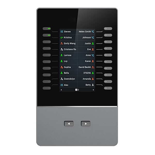 | คุณลักษณะเด่น | • จอสี TFT Color LCD ขนาด 4.3 นิ้ว (272x480) • มี 20 lines ปุ่มต่อหน้า (แต่ละโมดูลมี 2 หน้า สูงสุด 40 บรรทัดต่อโมดูล) • รวม 4 Daisy-Chained โมดูล สำหรับ 160 Contacts/Extensions • รองรับ BLF, วางสาย/รับสาย, โทรด่วน, แสดงตน, อินเตอร์คอม, โอน/ส่งต่อการประชุมด้วยเสียง และอื่นๆ |