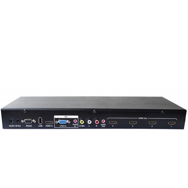 รองรับสัญญาณขาเข้า แบบ VGA/Composite/HDMI เป็น video splitter ในตัว โดยเลือกแสดงภาพเหมือนกันทั้ง 4 output ได้ มีโหมดในการแสดงภาพแบบ Video Wall 2x2 จากสัญญาณใด ๆ ได้ ต่อพ่วงกันแบบ multi-level cascading เพื่อสร้าง Video Wall แบบ 3x3, 4x4... (สูงสุด 10x10). สนับสนุน การหมุนภาพ แบบ 180° ได้ จึงสามารถใช้จอทีวีทำ wall ได้ ช่วยแก้ปัญหาจอขอบล่างหน้า โดยการพลิกจอด้านลนกลับหัว สนับสนุนความละเอียดสูงถึง 1080p Full HD มีช่องต่อ USB storage ทำหน้าที่เป็น media player ในตัว (ไม่รองรับเสียงขาออกสำหรับโหมดนี้) สนับสนุนการควบคุมใช้งานได้จาก ปุ่มกดหน้าเครื่อง, IR remote control และ RS232 control หมายเหตุ ไม่รองรับการใช้ร่วมกับจอ 4K ที่เป็น HDR10+ เช่น SAMSUNG NU7100 SERIESรายละเอียด