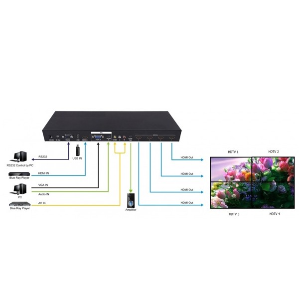 อุปกรณ์ 2x2 Full HD Video Wall Controller (วิดีโอวอลล์) ที่มีช่องสัญญาณทั้ง VGA, HDMI, Composite Video สามารถใช้จอทีวีธรรมดาที่ขอบล่างหน้า พลิกกลับหัวจอด้านบนได้ แก้ปัญหาจอขอบล่างหนา ควบคุมการทำงานได้ง่าย ๆ จาก IR remote, Telnet RS-232 หรือ ปุ่มกดด้านหน้า