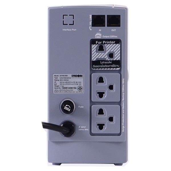SYNDOME S5-800 (800VA/360Watt) มีระบบป้องกันไฟกระชากทางสายโทรศัพท์ (Surge Protection)