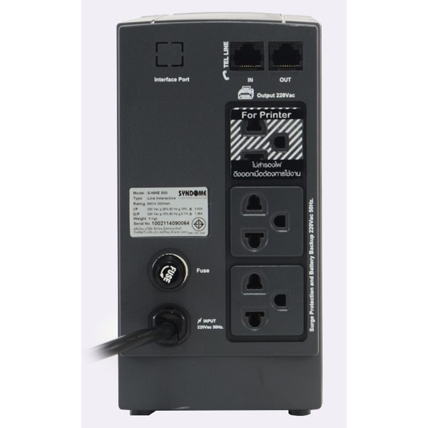 SYNDOME S9-800 (800VA/360Watt) จ่ายกำลังไฟได้เต็ม VA/Watt มีระบบป้องกันไฟกระชากทางสายโทรศัพท์ (Surge Protection)