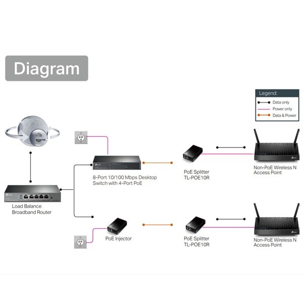 อะแดปเตอร์ PoE Splitter รุ่น TL-PoE10R มาตรฐาน IEEE 802.3af, มี 1 พอร์ต PoE และ 1 พอร์ต LAN แบบกิกะบิต 10/100/1000Mbps ใช้สำหรับแปลงไฟ PoE มาตรฐาน 802.3af (จาก PoE Switch หรือ PoE Injector ที่เป็น PoE มาตรฐาน 802.3af) เป็น 12V-1A, 9V-1A, 5V-2A สำหรับอุปกรณ์ Network ที่ไม่รองรับการจ่ายไฟ PoE เช่น Access Point กล้อง IP หรือ IP Phone เป็นต้น