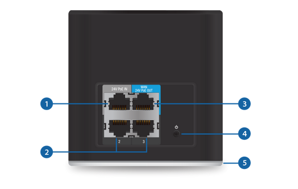 มี 4-Port Gigabit Ethernet แบบ RJ-45 โดยพอร์ตที่ 1 รองรับ 24V PoE IN พอร์ตที่ 2-3 เป็น LAN Switch และพอร์ตที่ 4 รองรับ WAN / 24V PoE OUT มีช่อง Power Port และไฟ LED แสดงสถานะการทำงานของ Ubiquiti ACB‑AC