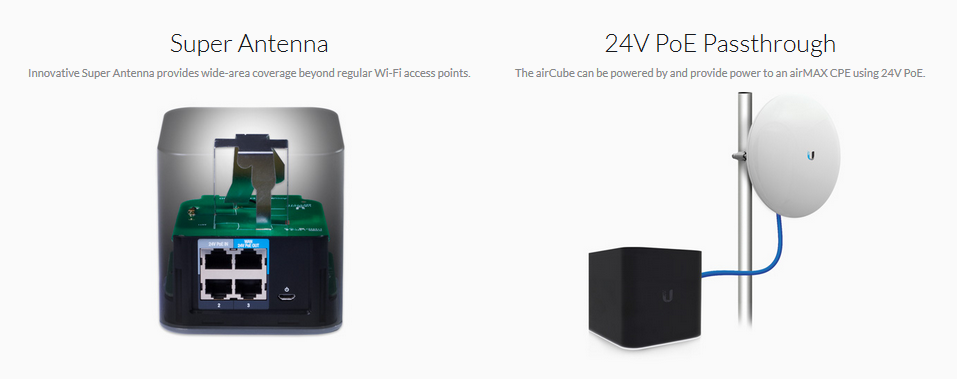 | คุณลักษณะเด่น | • (4) Gigabit Ethernet Ports • 24V PoE Passthrough for airMAX CPE • Dual-Band, 802.11ac, 2x2 MIMO Technology • Up to 300 Mbps in the 2.4 GHz Radio Band • Up to 866.7 Mbps in the 5 GHz Radio Band • Powered by 24V Passive PoE or Included Power Adapter |