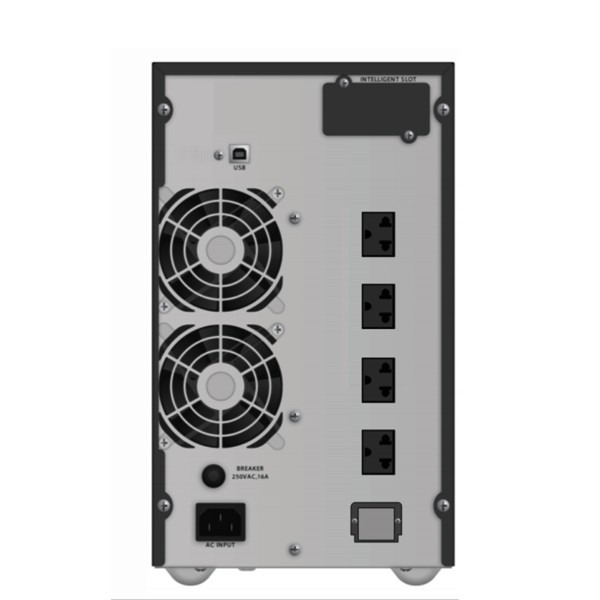 | คุณลักษณะเด่น | • True online double-conversion design • DSP Control • 0.9 Output Power Factor, Wide Input Range Factor • High Efficiency 97% (ECO mode) • Frequency Converter Mode • Input THDI < 5%, Output THDv <2% Linear load • Programmable LCE Display • Extendable Run Time • Recharge to 90% battery capacity within 4 hours • Free Power Management Software • Optional SNMP & Relay Cards • Battery Type Sealed Lead Acid Maintenance Free |
