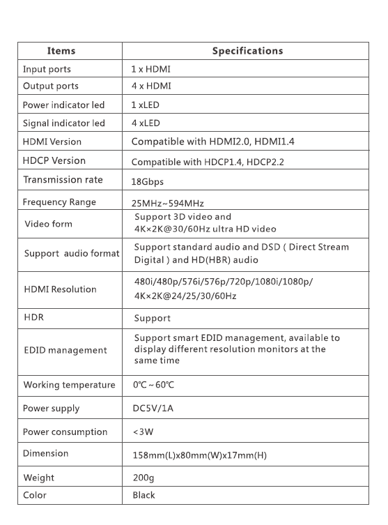 แจกจ่ายแหล่งสัญญาณ HDMI 1 รายการไปยังจอแสดงผล HDMI 4 จอ รองรับความละเอียดระดับ Ultra HD 4K × 2K @ 60Hz รองรับ HDMI 3D สนับสนุน YUV 4: 4: 4 Support HDR รองรับ HDMI 2.0 และ HDCP2.2 Low power consumption รองรับการกำหนดค่าความละเอียดของวิดีโอโดยอัตโนมัติตามความสามารถของจอภาพที่เชื่อมต่อแต่ละจอช่วยให้สามารถแสดงผลการแสดงผล 4K และ 1080p ที่ผสมกันได้พร้อมกัน Plug and playสเปคสินค้า