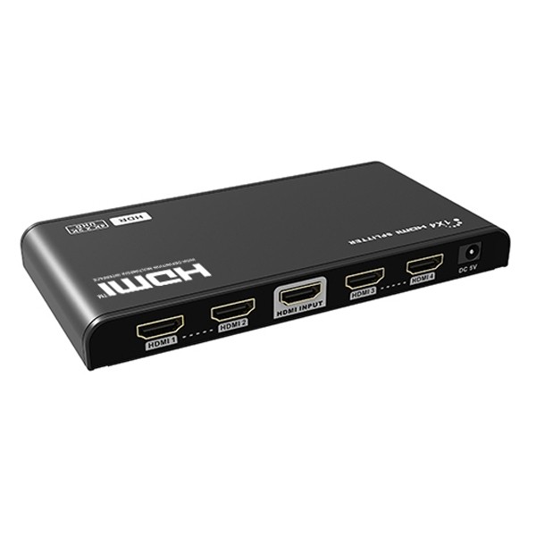 อุปกรณ์ตัวแยกสัญญาณ HDMI 1x4 กระจายแหล่งสัญญาณ HDMI 1 ไปยังจอแสดงผล HDMI 4 จอพร้อมกัน ใช้สำหรับ STB, DVD, Media Player, แล็ปท็อป, D-VHS และอุปกรณ์ HD-Player อื่น ๆ เข้ากันได้กับ HDMI 3D และ 4Kx2K