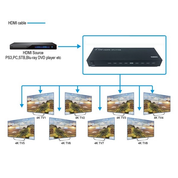 กระจายสัญญาณ HDMI ภาพพร้อมเสียงจาก 1 input ออก 8 output มีอัตราการส่งข้อมูล 10.2 Gbps รองรับระบบสีแบบ 12-bit Deep Full HD, Full 3D และ 4Kx2K Video รองรับความละเอียด 480i@60Hz, 480P@60Hz, 576i@50Hz, 576P@50Hz, 720P@50@60Hz, 1080i@50@60Hz, 1080P@50@60Hz, 3D HDMI (720P@50@60Hz, 1080P@24Hz) 3840x2160@24@25@30Hz รองรับระบบเสียงมาตรฐาน และ DSD (Direct Stream Digital) และ HD (HBR) Audio รองรับ 3D videoรายละเอียด