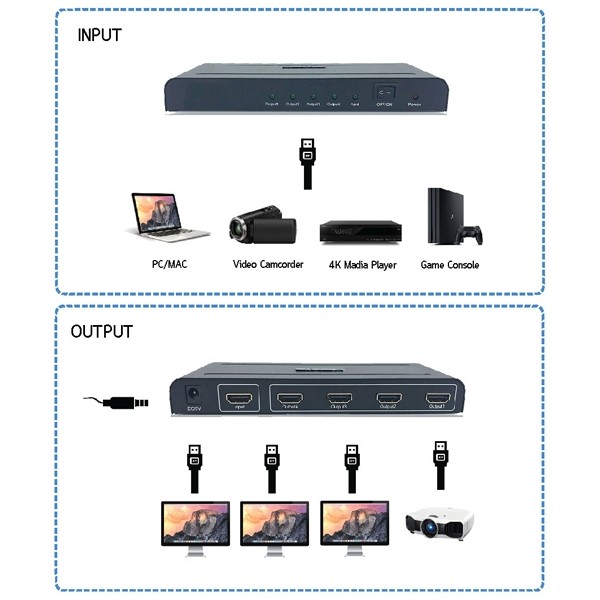 กระจายสัญญาณ HDMI จากเครื่องเล่นต่าง ๆ เช่น DVD, Bluray, Playstation หรือ PC/Notebook 1 แหล่งสัญญาณขาเข้า ออก 4 จอพร้อมกัน