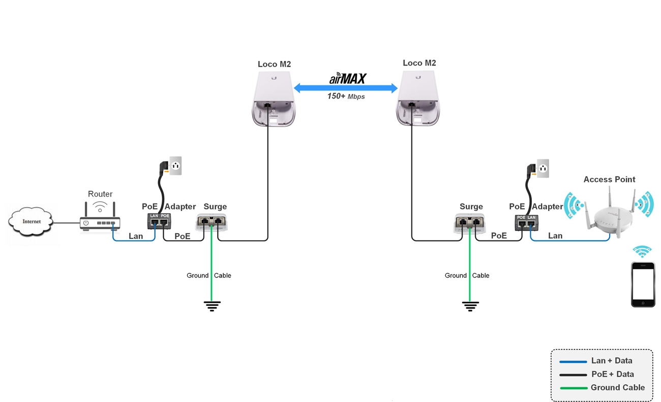 การติดตั้งชุดอุปกรณ์ Ubiquiti locoM2-SET เพื่อเชื่อมต่อระบบเครือข่ายคอมพิวเตอร์แบบไร้สาย (Wireless Link) สามารถติดตั้งใช้งานง่ายประหยัดเวลาและค่าใช้จ่าย โดยนำอุปกรณ์ตัวส่ง locoM2 ต่อเข้ากับระบบเครือข่ายต้นทางและ locoM2 ตัวรับต่อเข้ากับระบบเครือข่ายปลายทาง ปรับหน้าเสาอากาศเข้าหากัน สังเกตุระดับไฟ LED ที่ตัวอุปกรณ์จะแสดงสถานะการเชื่อมต่อไฟติดเต็มสเกลคือดีที่สุด สามารถเข้าไปดูค่าคุณภาพความแรงสัญญาณโดยละเอียดที่หน้า Status ของอุปกรณ์ได้ทั้งสองฝั่ง และเพื่อความปลอดภัยแนะนำใช้อุปกรณ์ Surge ป้องกันฝ้าผ่า Ubiquiti ETH-SP-G2 ต่อเข้ากับระบบเครือข่ายของเรา ดังแสดงการต่อใช้งานตามรูป