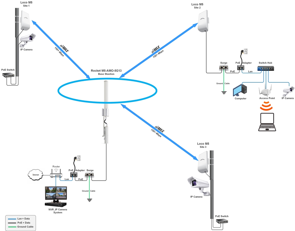 การติดตั้งชุดสถานีฐาน rocket M5-AMO-5G13-SET เพื่อเชื่อมต่อระบบเครือข่ายคอมพิวเตอร์ไร้สายแบบจุดต่อหลายจุด Point to Multipoint สามารถติดตั้งใช้งานง่ายประหยัดเวลาและค่าใช้จ่าย โดยนำอุปกรณ์ตัวแม่ข่าย rocket M5-AMO-5G13-SET (Main) ต่อเข้ากับระบบเครือข่ายต้นทาง และ Loco M5 (Site) ตัวรับได้หลายตัวต่อเข้ากับระบบเครือข่ายปลายทาง ปรับหน้าเสาอากาศเข้าหาตัวแม่ข่าย สังเกตระดับไฟ LED ที่ตัวอุปกรณ์จะแสดงสถานะการเชื่อมต่อไฟติดเต็มสเกลคือดีที่สุด สามารถเข้าไปดูค่าคุณภาพความแรงสัญญาณโดยละเอียดที่หน้า Status ของอุปกรณ์ได้ทั้งสองฝั่ง และเพื่อความปลอดภัยแนะนำใช้อุปกรณ์ Surge ป้องกันฝ้าผ่า Ubiquiti ETH-SP-G2 ต่อเข้ากับระบบเครือข่ายของเรา ดังแสดงการต่อใช้งานตามรูป