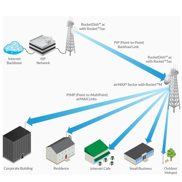 ชุดไวเลสลิงค์ประสิทธิภาพสูง ระยะไกล 10-20 กม. ด้วยมาตรฐานใหม่ Wi-Fi 802.11AC ให้ความเร็วในการรับส่งมากกว่า 450Mbps ใช้ความถี่ 5GHz กำลังส่ง 500mW(27dBm), RAM 128MB, พอร์ตแลน Gigabit ติดตั้งมาพร้อมเสาอากาศ RocketDish ขนาด 31dBi เทคโนโลยี airMAX Carrier Class 2x2MIMO อุปกรณ์ในชุดพร้อมติดตั้งมีตัวรับ ตัวส่ง เซ็ตอัพแล้ว พร้อมใช้งาน เหมาะกับการทำ Point-to-Point เชื่อมโยงเครือข่ายคอมพิวเตอร์ความเร็วสูง