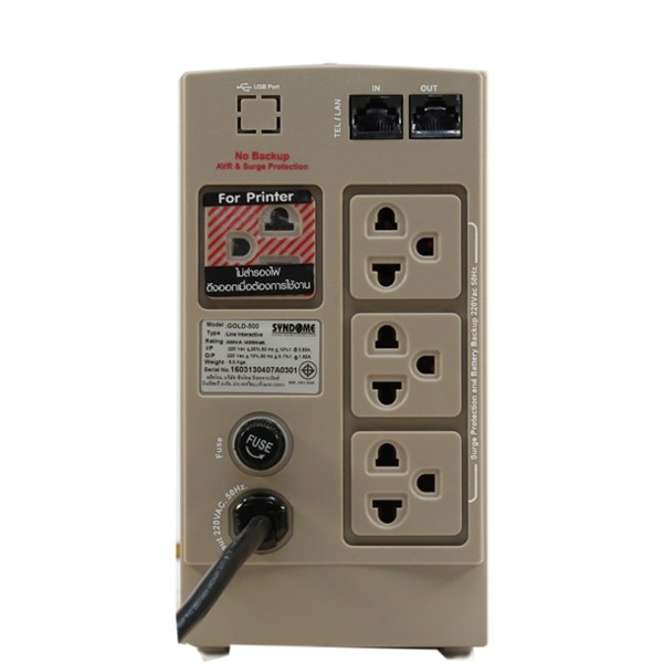 เครื่องสำรองไฟฟ้า GOLD-800I ขนาดกำลังจ่าย 800 Voltamp, 480 Watt ระบบ Line Interactive with Stabilizer ปรับแรงดันไฟฟ้าอัตโนมัติ ป้องกันปัญหาไฟฟ้าเกินหรือไฟตก เหมาะสำหรับการใช้งานในที่ที่มีความผันผวนของแรงดันไฟฟ้า มี 4 เต้ารับไฟฟ้าขาออกแบบ Universal เสียบได้ทั้งขากลมและขาแบน พร้อมขากาวน์ ระยะเวลาในการสำรองไฟที่ 20-30 นาที (เทียบโหลดคอมพิวเตอร์พร้อมจอ 1 ชุด) ควบคุมการทำงานด้วย Microprocessor, จ่ายกำลังไฟได้เต็ม VA/Watt, เปลี่ยน Battery อย่างง่ายดายด้วยมือเปล่า, มี TEL Line Protection ระบบป้องกันไฟกระชากทางสายโทรศัพท์