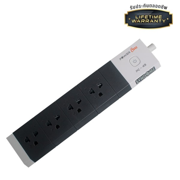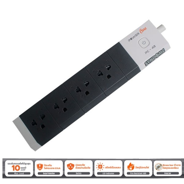 รางปลั๊กไฟ PC-43 ขนาด 4 เต้าเสียบ เต้ารับมาตรฐาน มอก.2432-2555 ปลอดภัยด้วยม่านนิรภัย สมารถเสียบได้ทั้งขากลมและขาแบน พร้อมขากราวด์, รองรับกระแสไฟถึง 2500 วัตต์ / 10 แอมป์(สูงสุด), วัสดุเป็นพลาสติก PVC แบบไม่ลามไฟ Brass bar ทำจากวัสดุทองเหลือง, ป้องกันไฟกระชาก (Surge Protection) 8 kA, ขนาดสายยาว 3 เมตร