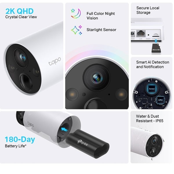 | คุณลักษณะเด่น | • 2K QHD - ความละเอียดภาพที่มากขึ้น 1.7 เท่า ช่วยให้ภาพคมชัดทุกรายละเอียด • 180-Day Battery Life* - ตัวกล้องใช้พลังงานต่ำ และมาพร้อมแบตเตอรี่ชาร์จซ้ำได้ • Full-Color Night Vision - แสดงรายละเอียดและสีคมชัดสูงในตอนกลางคืน ด้วยเซ็นเซอร์ Starlight • Smart AI Detection and Notification - ระบบ Smart AI สามารถตรวจจับบุคคล สัตว์เลี้ยง และรถยนต์ พร้อมการแจ้งเตือนผ่านแอปพลิเคชัน • Wire-Free Placement - สามารถติดตั้งได้ทุกที่ตามต้องการ โดยไม่ต้องใช้สายแลน และสายไฟ • Light and Sound Alarm - ส่งสัญญาณเตือนด้วยเสียงและไฟส่องสว่างเมื่อพบการเคลื่อนไหว • Two-Way Audio - สามารถตอบโต้สื่อสารผ่านลำโพงและไมโครโฟนในตัว • Flexible Storage Choices - สามารถบันทึกวิดีโอลงใน microSD card (รองรับสูงสุดถึง 256 GB)†, หรือใช้บริการ Tapo Care** บันทึกผ่าน Cloud storage • IP65 Water&Dust Resistant - มีประสิทธิภาพในการกันน้ำและกันฝุ่นเป็นอย่างดี รองรับทุกสภาวะอากาศ |