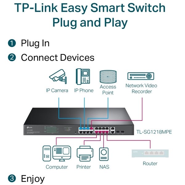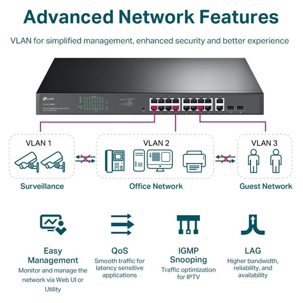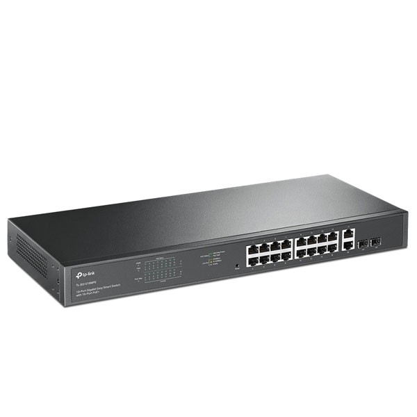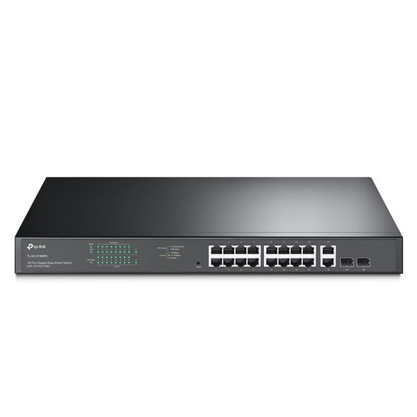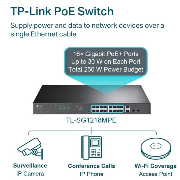 อุปกรณ์ PoE สวิตซ์ TL-SG1218MPE ขนาด 16 พอร์ตกิกะบิต RJ45 ความเร็ว 10/100/1000Mbps. โดย 16 พอร์ต (1-16 Ports) เป็น PoE/PoE+ (มาตรฐาน IEEE 802.3af/at) จ่ายไฟรวม 250 วัตต์, และ 4 พอร์ตแบบ Combo Gigabit (RJ45 2 Port และ SFP 2 Slots) เป็น Uplink (สามารถเลือกใช้งานอย่างใด อย่างหนึ่ง), สามารถบริหารจัดการได้ รองรับ VLAN, IGMP Snooping, Loop Prevention, ตัวเครื่องเคสเป็นโลหะ สวยงามแข็งแรง รองรับติดตั้งในตู้แร็ค แบบแขวนผนังและวางบนโต๊ะ เหมาะสำหรับเชื่อมต่ออุปกรณ์เครือข่ายและจ่ายไฟเลี้ยงให้อุปกรณ์ PoE เช่น Wall AP, Ceiling AP และ IP Camera เป็นต้น