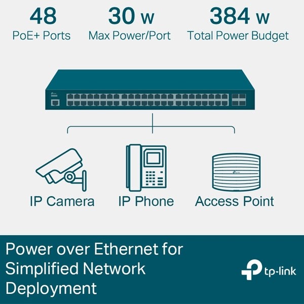 อุปกรณ์ PoE สวิตซ์ TL-SG3452P ขนาด 48 พอร์ตกิกะบิต RJ45 ความเร็ว 10/100/1000Mbps.โดย 48 พอร์ต (1-48 Ports) เป็น PoE/PoE+ (มาตรฐาน IEEE 802.3af/at) จ่ายไฟรวม 384 วัตต์, และ 4 พอร์ตแบบ Gigabit SFP Slots เป็น Uplink, สามารถบริหารจัดการได้ (Smart Switch) รองรับการทำ VLAN IP-MAC-Port Binding, ACL, Port Security, DoS Defend, Storm control, DHCP Snooping, 802.1X, รองรับ Omada Cloud-Based Controller, ตัวเครื่องเคสเป็นโลหะ สวยงามแข็งแรง รองรับติดตั้งในตู้แร็ค แบบแขวนผนังและวางบนโต๊ะ เหมาะสำหรับเชื่อมต่ออุปกรณ์เครือข่ายคอมพิวเตอร์ความเร็วสูง