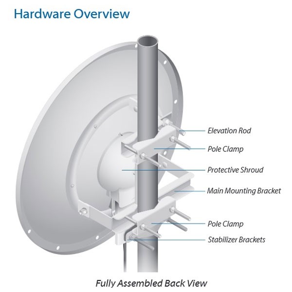 เสาอากาศ RD-5G30 แบบจาน Dish เทคโนโลยี Carrier Class 2x2 ขนาด 30dBi ความถี่ 5GHz ความเร็วรับ-ส่งข้อมูล 150+Mbps ออกแบบมาสำหรับติดตั้งเข้ากับ Rocket M5 เหมาะสำหรับเชื่อมเครือข่ายไร้สายระยะไกล 10-15 กิโลเมตร แบบจุดต่อจุด Point-to-Point เป็น Backhaul Network ติดตั้งง่ายแข็งแรงทนทาน