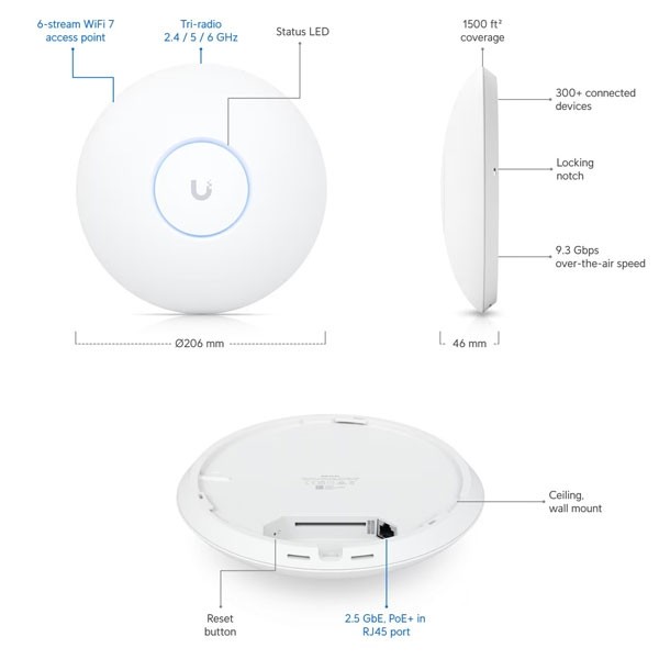 Ubiquiti U7-Pro (UniFi 7 Pro) 8.7Gbps. Tri-Radio 2.4,5,6GHz, 6 spatial streams WiFi7 ac/ax/be, Ceiling Indoor Access Point, 1 x 2.5 GbE RJ-45 Port PoE+ Support (PoE Not Included)